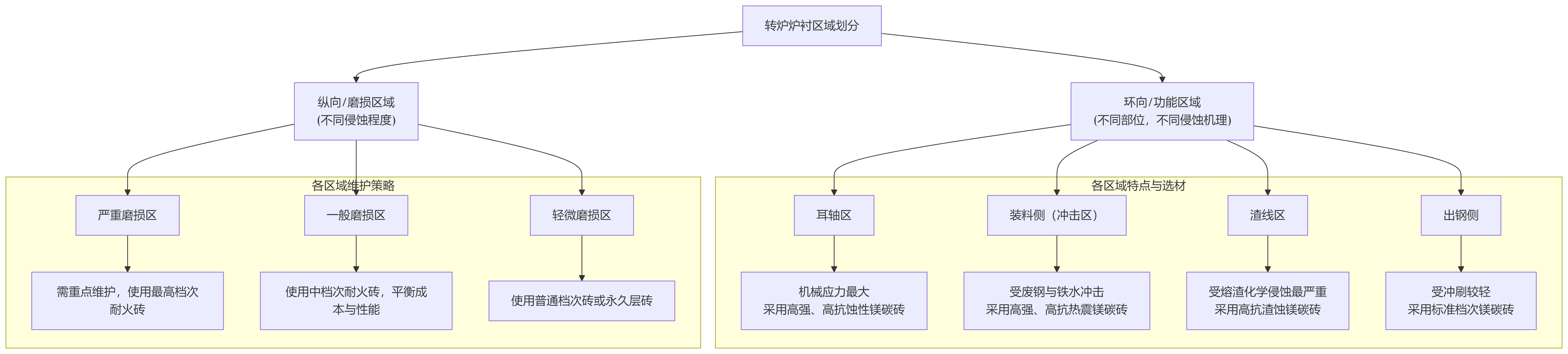 这是一个非常专业且重要的问题。转炉炉衬根据其工作环境和损毁机理的不同,被划分为几个关键区域,并相应采用不同材质和厚度的耐火材料,这种方法被称为“综合砌筑”。